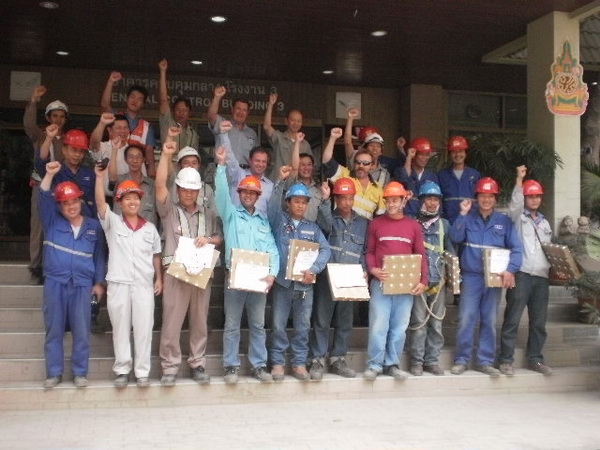 從左到右:SCCC安全顧問Mr. Guy, SCCC項目經理Mr. Prapan, SCCC董事長Mr.Philip,中材節能京都項目部項目經理侯躍光,SCCC顧問Mr. Bill,SCCC 安全隊長Mr. Sumrit,中材節能京都項目部現場經理江向東。