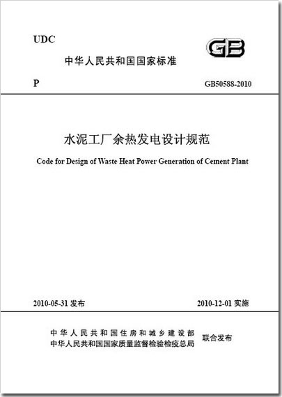 中華人民共和國住房和城鄉建設部發布第638號公告,由中國水泥協會、中材節能發展有限公司主編的國家標準《水泥工廠余熱發電設計規范》,自2010年12月1日起實施,標準編號GB50588-2010(http://www.csres.com/notice/38848.html)。