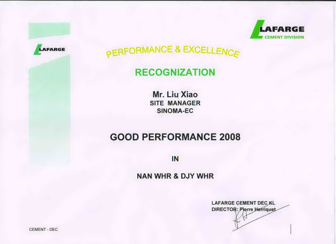 拉法基頒發給現場經理劉宵的榮譽證書