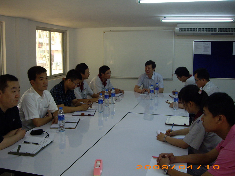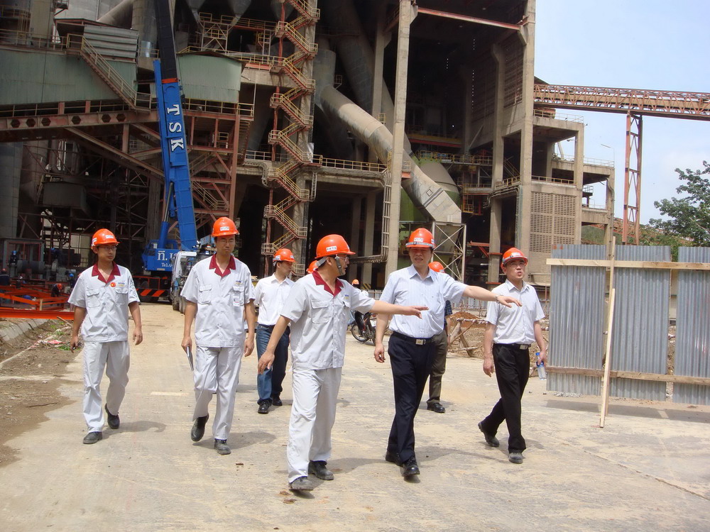 4月,泰國傳統的頌干節(相當于中國的春節)到來前期,張奇董事長率領市場部、技術部、采購部等部門負責人來到京都項目現場指導檢查工作。張董事長不顧旅途勞頓,清晨六點多即離開曼谷趕往項目現場所在地薩拉布里市郊的京都水泥廠。到達項目現場臨建辦公室后,隨即聽取了項目經理吳蘇軍代表現場項目部所作的工作匯報。根據匯報,結合項目當前總體執行情況,張董事長肯定了現場項目部的工作,并且指出,京都項目目前的總體執行情況符合公司制訂的計劃,要有信心依照總承包合同圓滿完成該項目。張董事長同時強調了京都項目的重要性,指示大家對后面的工作要盡早作出計劃,對各種可能出現的情況要做好充分準備,要適應業主的管理模式,在保證項目如期完成的同時,提高公司的項目管理水平,樹立中材節能更高的企業形象。王毅等三位部長也從各部門角度提出了具體的意見和建議。隨后,張董事長一行在項目部全體人員的陪同下查看了現場施工區域。